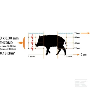 3 x TriCOND sor fehér/kék, egyenként 3 x 0,30 mm-es TriCOND huzallal, optimális vezetőképességet biztosít (akár 10 000 m kerítéshosszig).