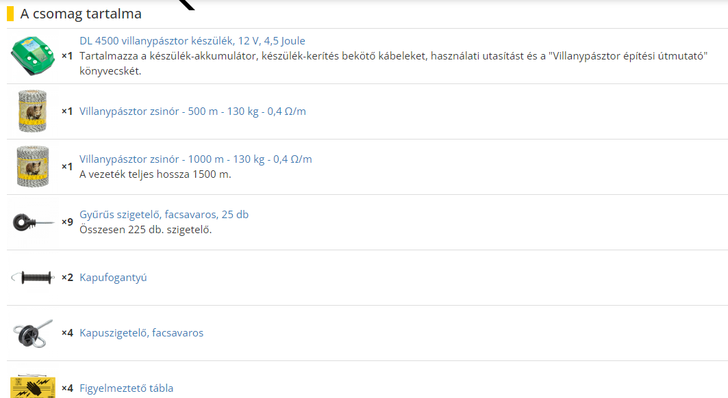 Villanypásztor alapcsomag vadállatok távol tartására. A csomag tartalmaz egy 4,5 Joule erősségű villanypásztor készüléket, 1500 m vezetéket, gyűrűs szigetelőket, kapufogantyút és kapuszigetelőket. A csomag nem tartalmazza