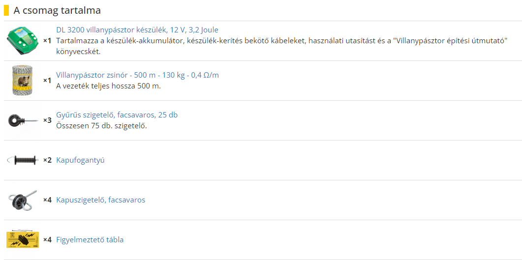 Villanypásztor alapcsomag vadállatok távol tartására. A csomag tartalmaz egy 3,2 Joule erősségű villanypásztor készüléket, 500 m vezetéket, gyűrűs szigetelőket, kapufogantyút és kapuszigetelőket. A csomag nem tartalmazza
